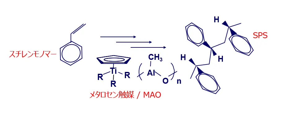 SPSとはシンジオタクチックポリスチレン(Syndiotactic Polystyrene)の略称で、出光興産㈱が1985年にメタロセン触媒を用いて世界で初めて合成に成功した結晶性ポリスチレンです。