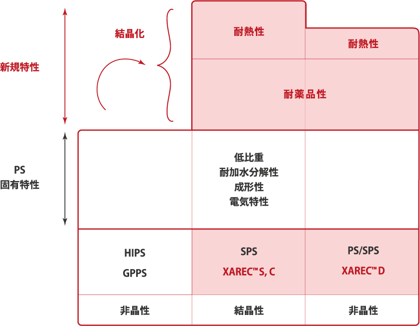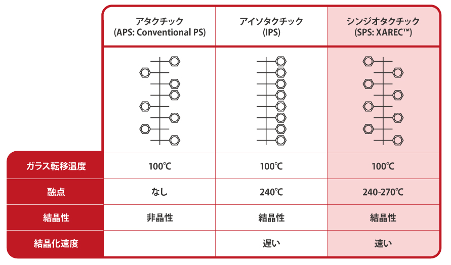 SPSは化学構造的には通常の汎用ポリスチレン(非晶性、アタクチックポリスチレン)と同じですが、シンジオタクチック構造と呼ばれる高い立体規則性を有しています。結晶化速度が非常に遅く工業生産化が難しいとされたアイソタクチックポリスチレンに対して、実用レベルの結晶化速度を有する結晶性樹脂です。